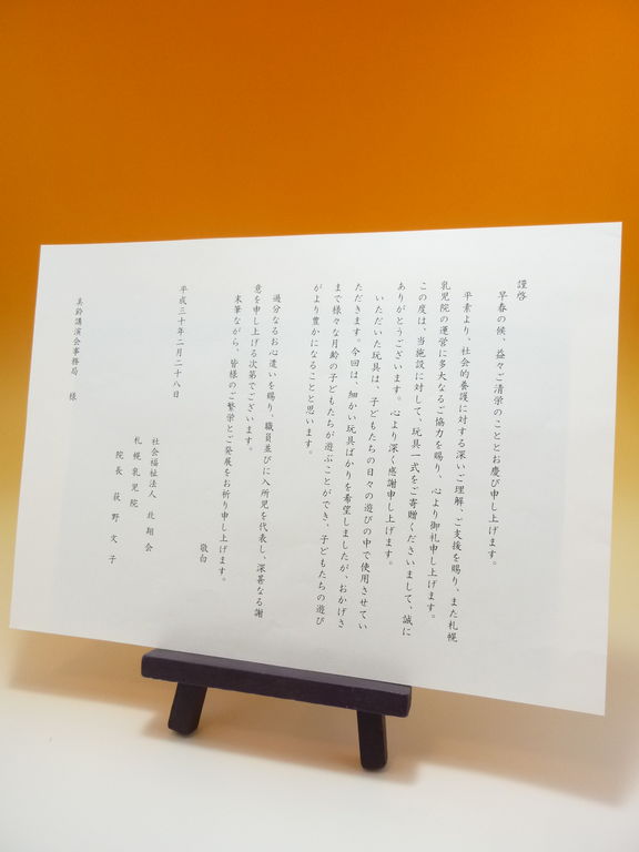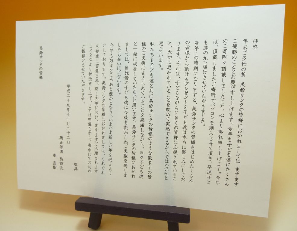 興正学園さんから、美鈴サンタ2017'の感謝状が届きました。(2017.12.26)