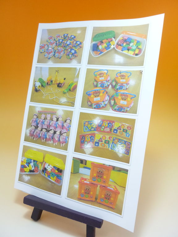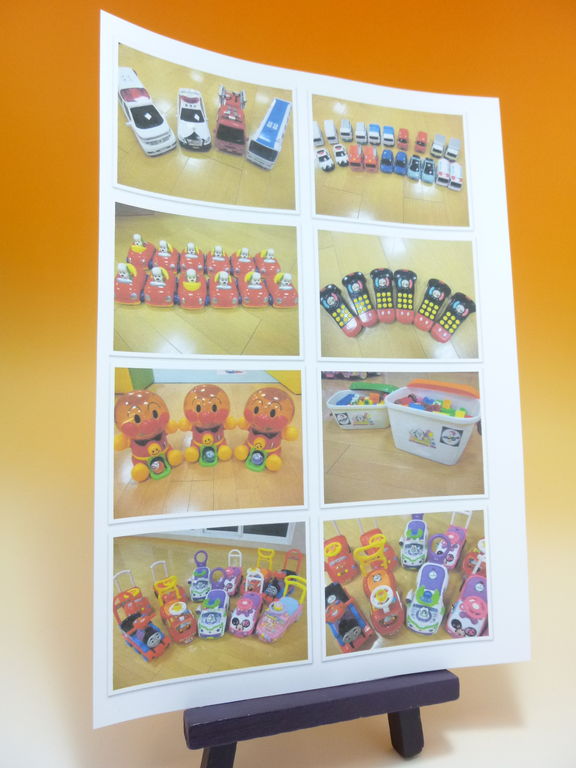 ままごとごっこができる赤ちゃんのぬいぐるみ、お料理する真似ができるお野菜セット、つみきなど小さい玩具が10種類近く購入できて年齢別の各部屋の子どもたちが喜んで遊んでるようです。
