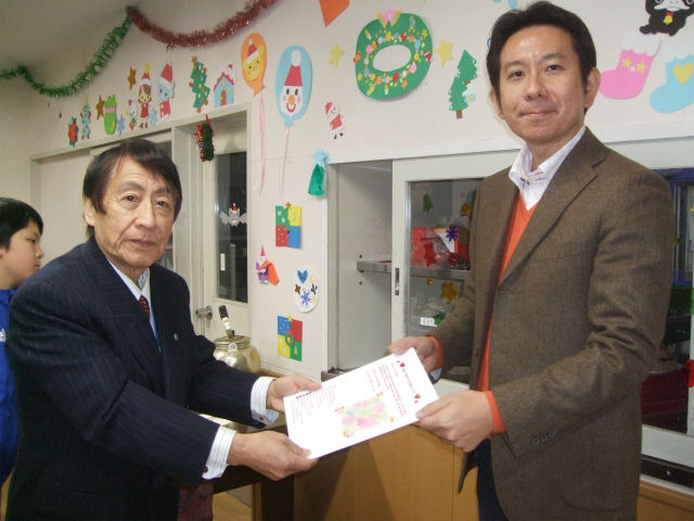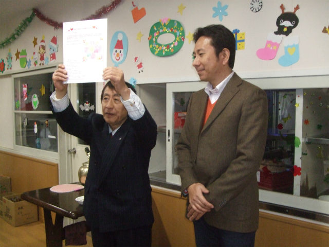 目録は、ぜひ子供達の前で、とクリスマスパーティ中の食堂におじゃまさせていただきました。あらためて美鈴サンタの趣旨を子供達の前でお伝えし、目録をお渡ししました。新しい自転車を乗る予定の小学生達が恥ずかしがりながら近寄って来て「ありがとう」と言ってくれました。子供達が全国のサンタの皆さんにくれた感謝の言葉は、とても清らかでした。
